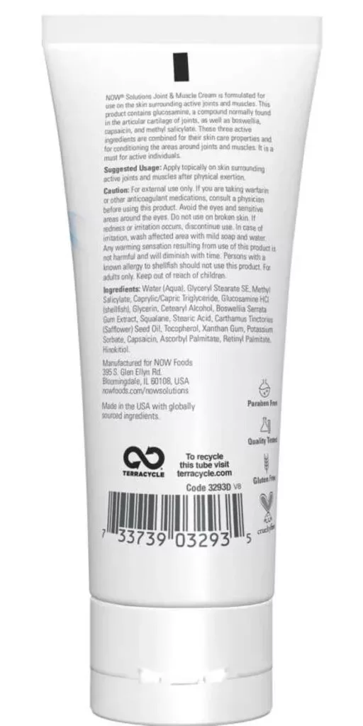 A NOW ® Solutions Joint & Muscle Cream krémet az aktív ízületeket és izmokat körülvevő bőrön való használatra tervezték. Ez a termék glükózamint, az ízületek ízületi porcában általában megtalálható vegyületet, valamint boswelliát, kapszaicint és természetes metil-szalicilátot tartalmaz. Ezt a három hatóanyagot kombinálják bőrápoló tulajdonságaik, valamint az ízületek és az izmok körüli területek kondicionálása érdekében. Aktív egyéneknek kötelező.